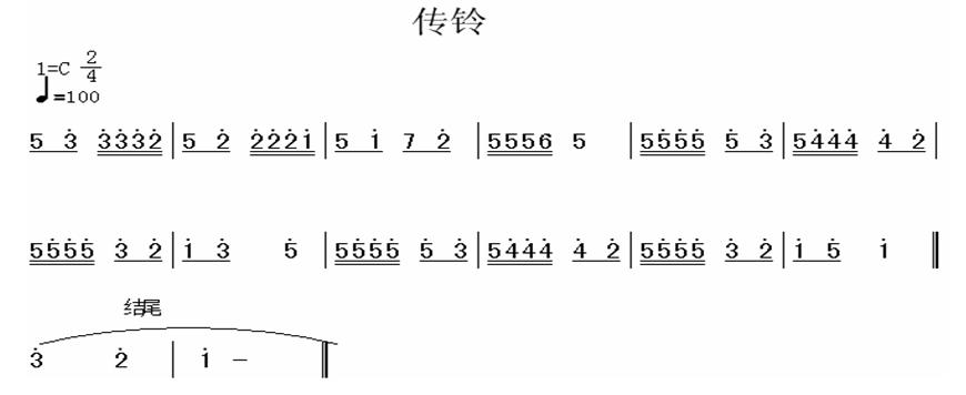 节合拍地摇铃,在第4小节的末拍将铃传给右边的小朋友,接铃的小朋友随5-8小节音乐继续摇铃,在第8小节未往下传,这样每四小节摇铃传铃一次,当听到尾声,请小朋友听到尾声的音乐,将铃轻轻地捂住,不让它响,当听到摇铃的音乐时,再继续摇铃、传铃。